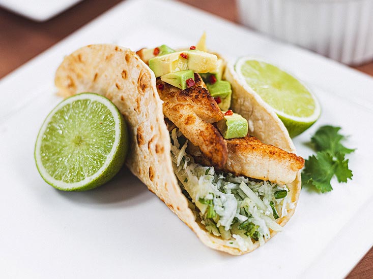 To serve: warm the tortillas in a lightly oiled pan or barbecue plate, or char over a flame. Fill with apple slaw, fried fish and a dollop of chilli avocado salsa. Serve with extra coriander sprigs, if you have them, and lime wedges.