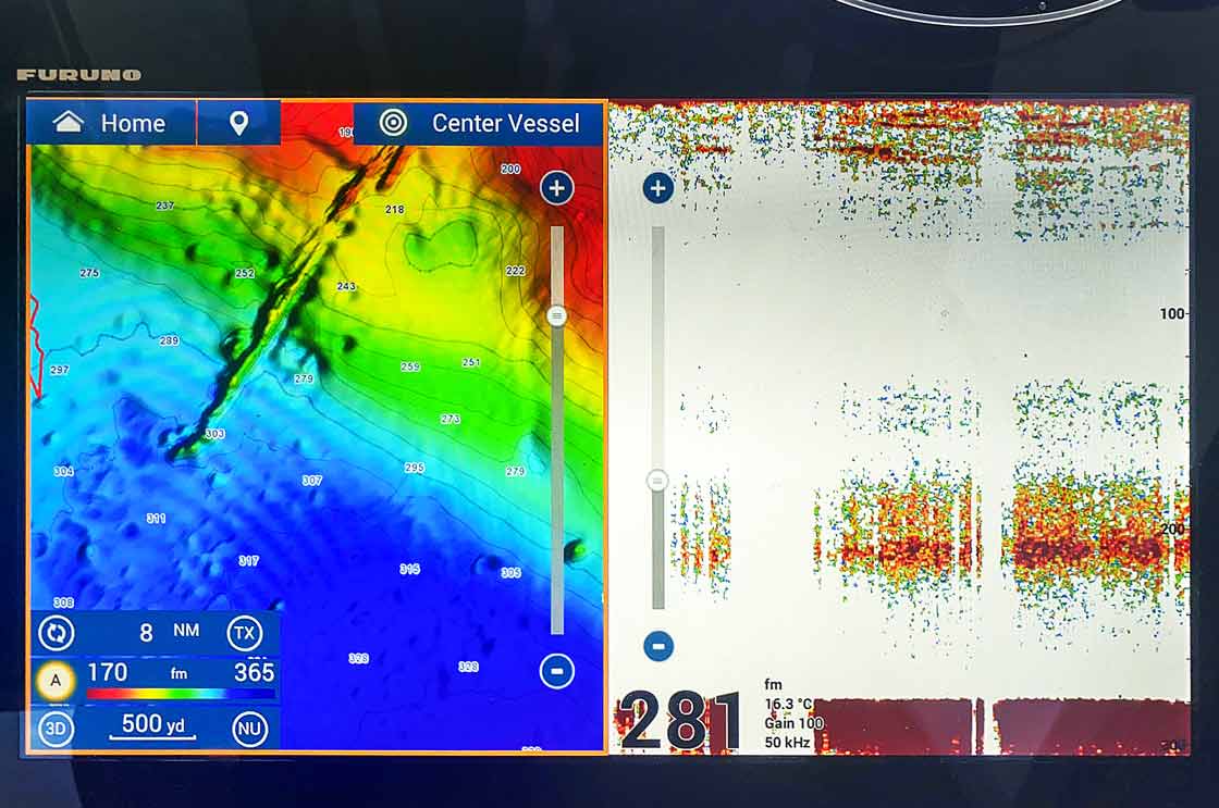 All of this means that you need multiple transducers if fishing offshore and inshore. To give you an idea, in my Northbank I run four transducers and two Furuno screens: SS175HW is my wide angle to find predators and bait, while SS175L and 82B are all about marking the bottom in water a kilometre deep. The final transducer is a WASP, a super-wide version that maps the bottom and helps to find bait over a larger area.
