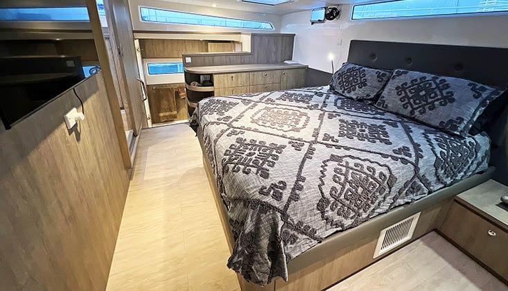 Its reverse-bow hulls are designed to minimise drag while having enough volume to take a substantial cruising load, and raked bulkheads above deck reduce windage, the bane of flybridges.