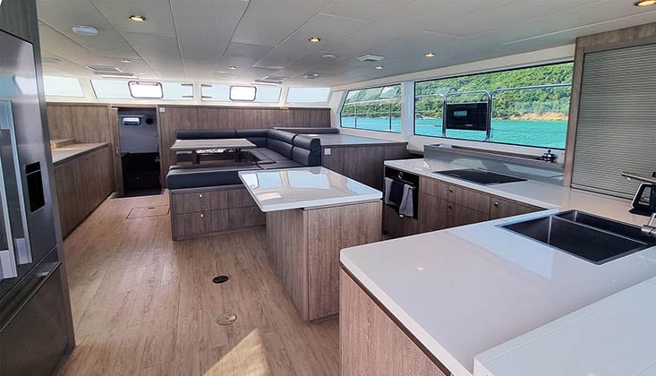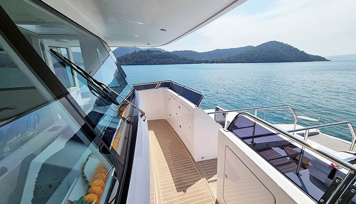 There are two configurations: Bluewater, with a more open layout suitable for temperate climates, and Expedition, which has more all-weather protection for the flybridge and cockpit.