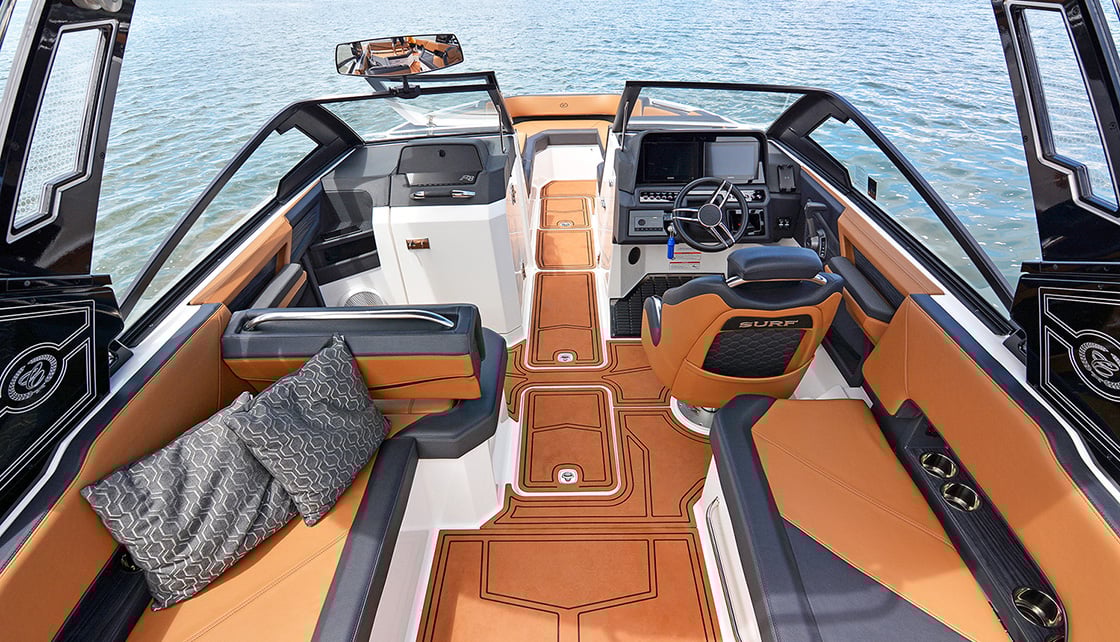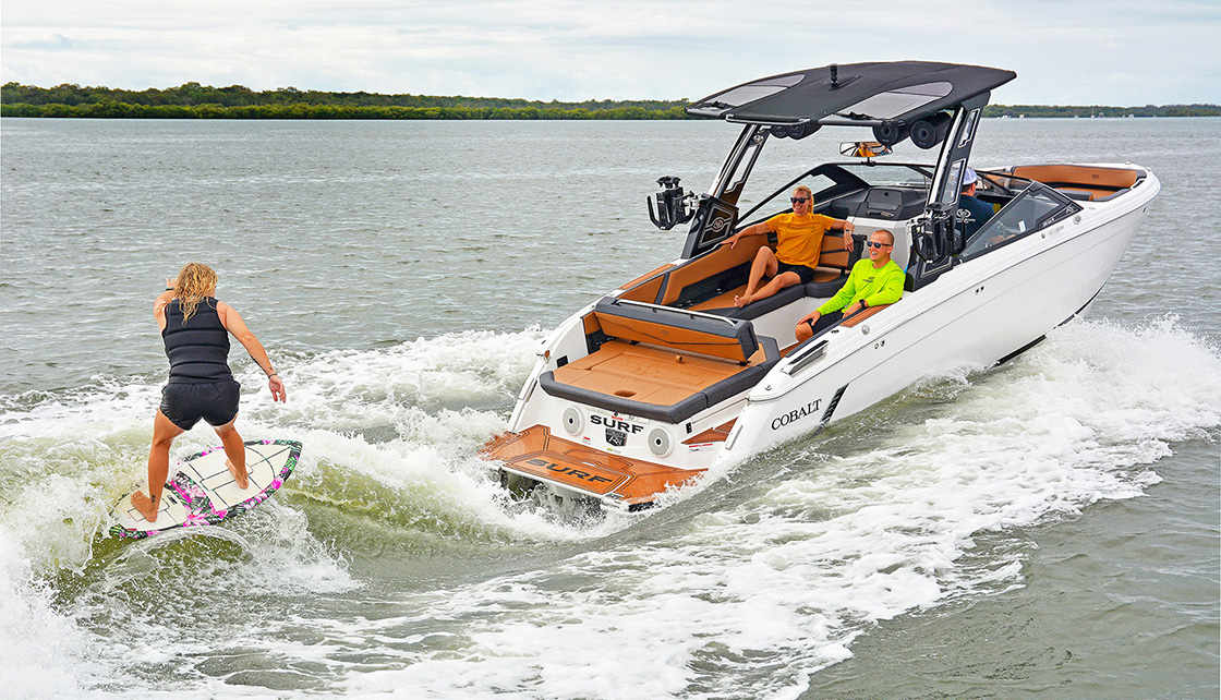 With a specially designed vee-hull, up to 430hp of inboard might, and technology designed to shape the perfect wake, Cobalt’s R8 Surf is a wave rider’s dream boat.
