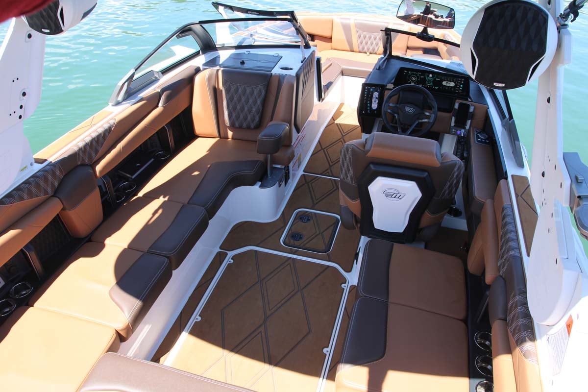 - Spacious and Luxurious Design: The Malibu M230 boasts a long, wide and deep hull with high freeboard, providing ample room and seating for passengers. It features premium Cool Touch upholstery, a wraparound cockpit lounge with abundant storage, and versatile rear lounge seating for optimal viewing of water activities.