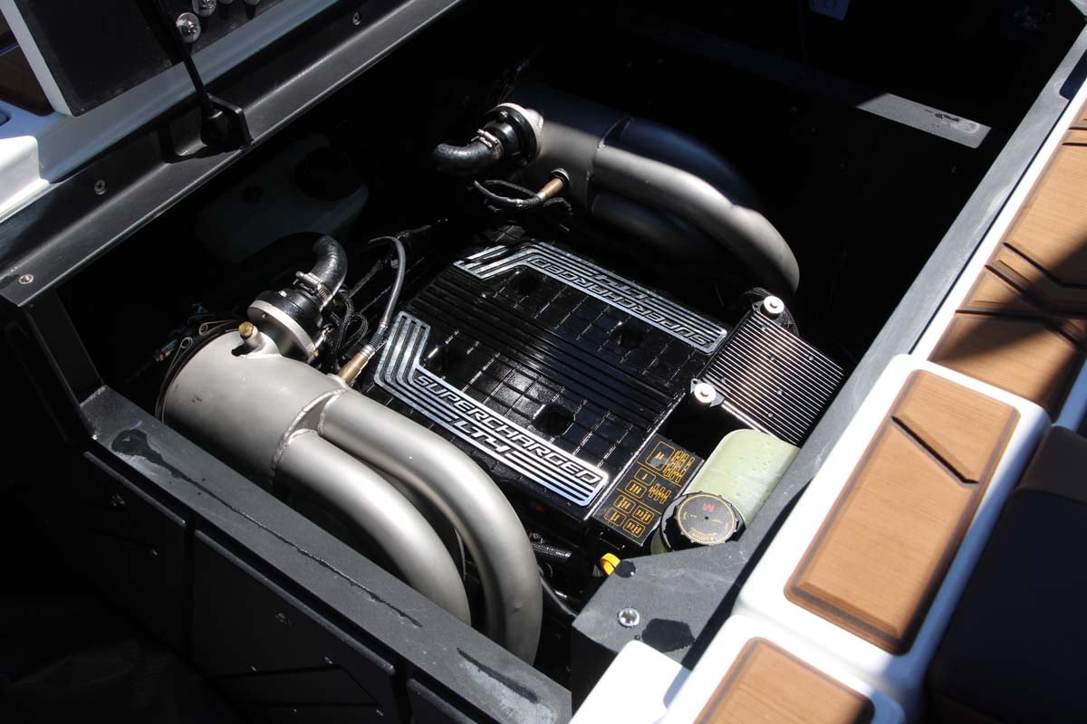 Our test boat was powered by Malibu’s range-topping supercharged 2026 Monsoon LT4 engine that puts out 652hp, up from 607hp on the previous model. Despite the M230’s size, the steering felt precise, light and surprisingly nimble, even in hard turns.