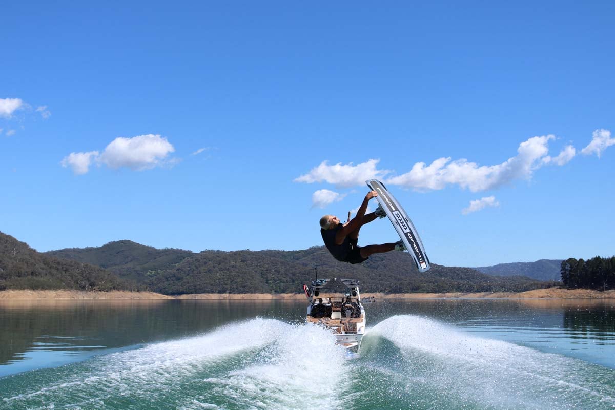 Our wakeboarding test pilot for the day was 13-year-old Malibu team rider Parker Edwards, who put on a show that impressed onlookers. With the ballast tanks full and the Power Wedge deployed, the huge wake provided a superb, smooth ramp for Parker to show off his tricks.