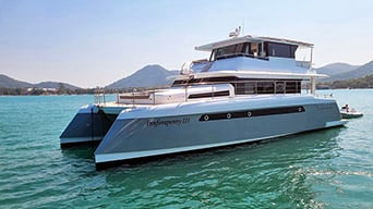 The beamy foredeck has room to set up a sunpad (cushions are included), or you could have a tandem lounge with a backrest built into the front of the cabin. Heading aft, cockpit access is via walkways on either side of the cabin framed by a stainless-steel rail. A timber folding table and cushion arrangements transform the area into an alfresco living zone.