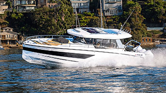 It’s priced from $429,000 and $539,000 as tested, which includes an upgraded bow thruster, trim tabs, battery charger, stereo, 7in sounder, table and cushions, caravan covers, painted hull, and painted rollbar.