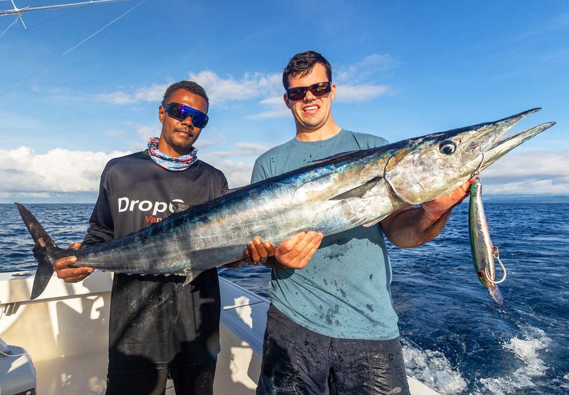 Things went quiet but once we reached the islands, we barely had time to swap out the heavy tackle for some lighter trolling rods before one of the lures went off. A slab of silver appeared and a wahoo was quickly hoisted aboard, much to the delight of Coops who was still ticking new species off his bucket list.