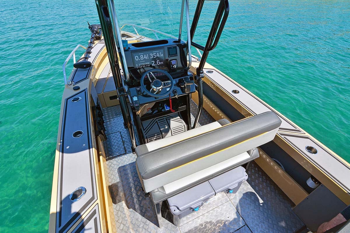 A standard treadplate (U-Dek optional) self-draining floor stretches 2.92m from the front casting deck aft to the transom wall. There’s a slender space (640mm) behind the helm for two anglers to fish over the 700mm-high transom.