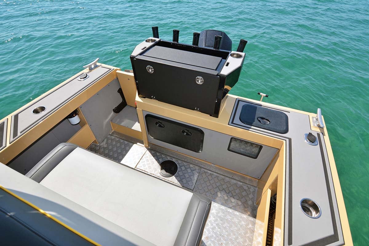 Across the transom you’ll find a starboard door step, an enclosed and elevated dual battery storage compartment, and a decent-sized livebait tank with an aquarium-style front viewing window to port.