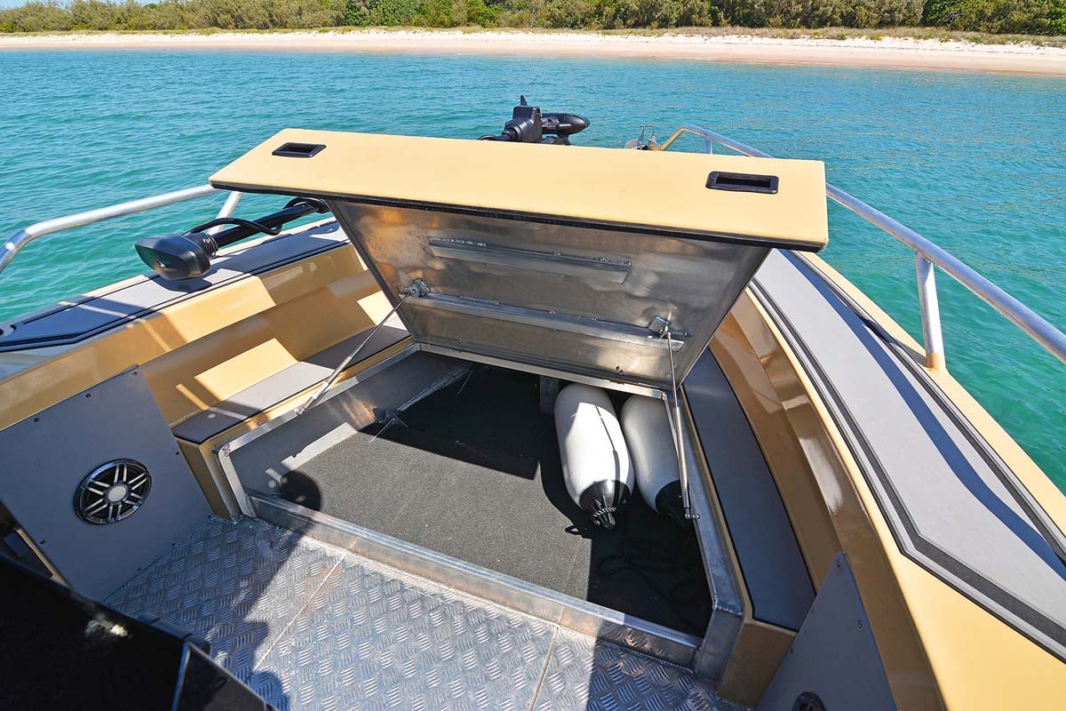 The elevated bow fishing deck sits 310mm above the main floor, above a large compartment that lifts on gas struts to store tackle bags, safety gear, fenders and more.