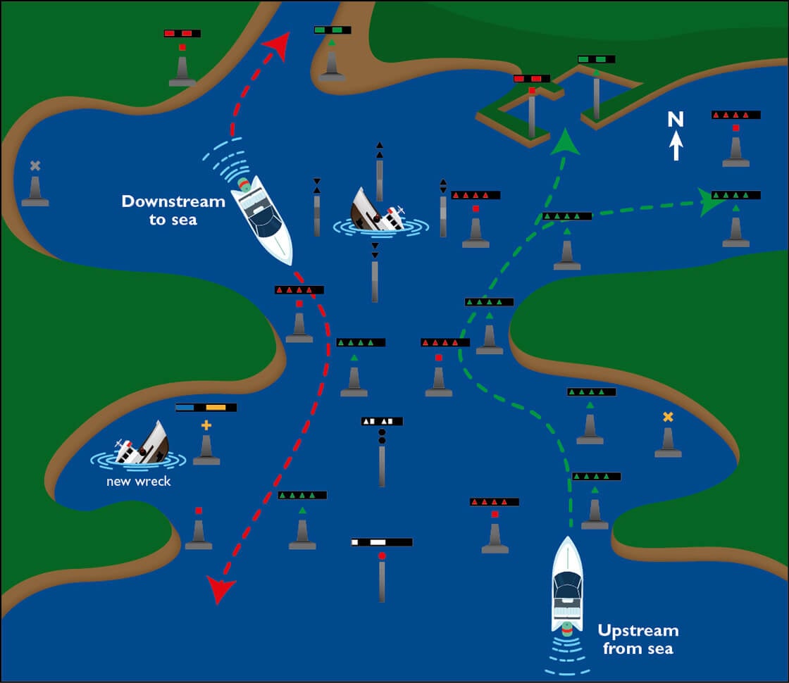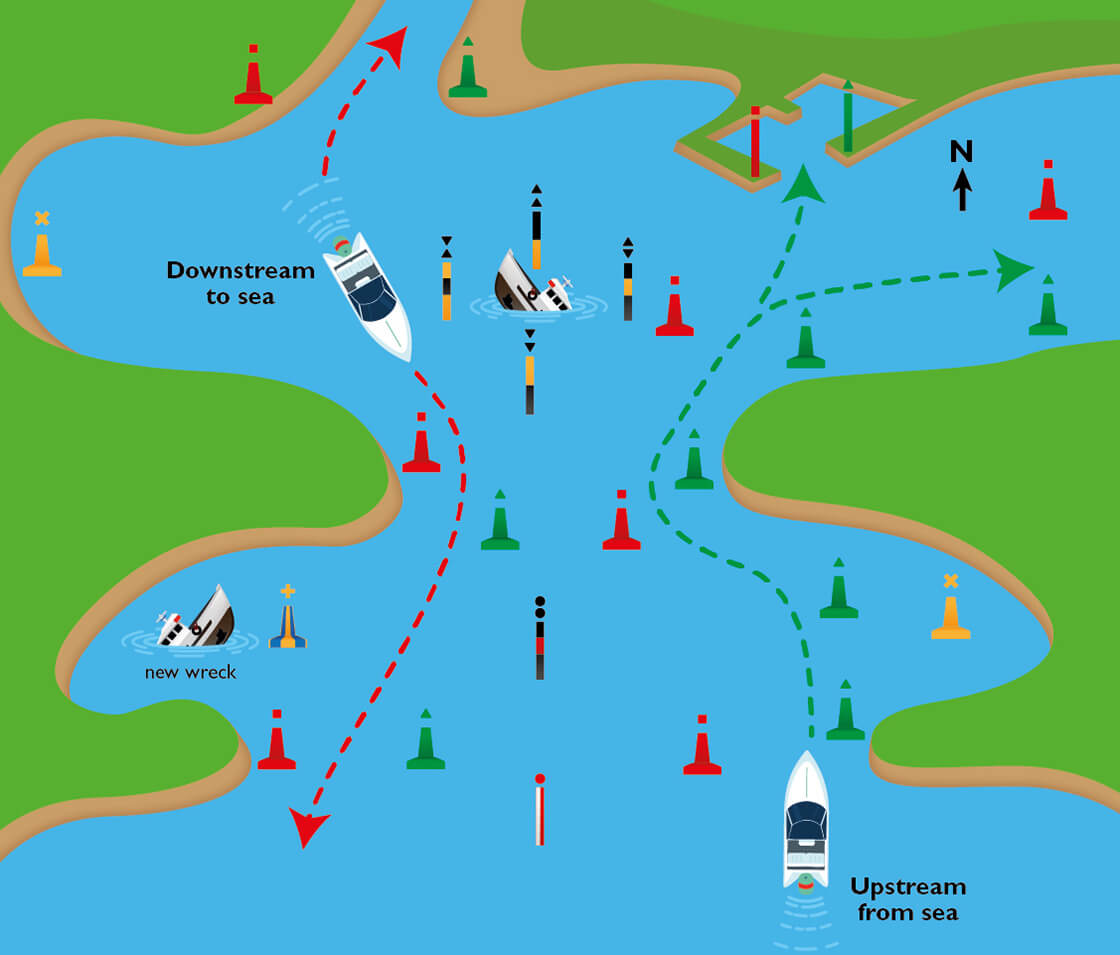 In the case of an isolated land mass farther offshore, marks are laid according to a clockwise direction of travel around it – so, when travelling up a river, pass the green marks on your boat’s starboard (right) side, and the red marks to your port (left) side. When travelling in the other direction toward the sea, do the opposite.