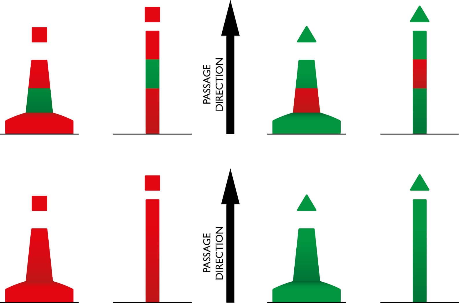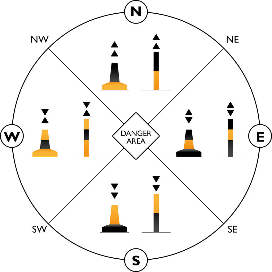 Named for the cardinal points of the compass, with each name indicating the direction of safe water, this group of four marks can be recognised by day by the orientation of their conical top marks, as well as the order of their black and yellow horizontal bands on the structure.