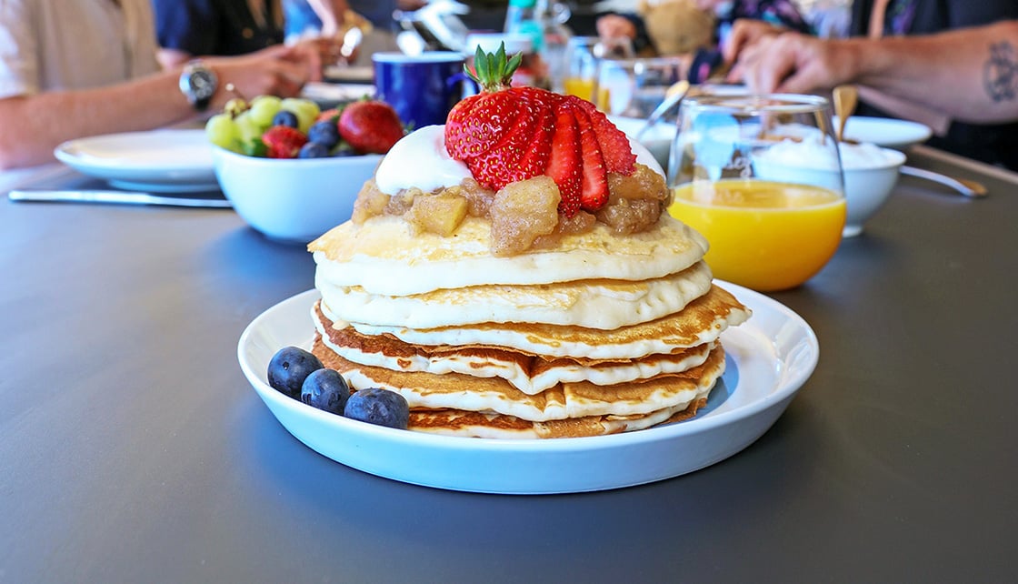 Who can resist fresh pancakes for brekky? Especially these, with their juicy fruit topping and a creamy dollop of coconut yoghurt.