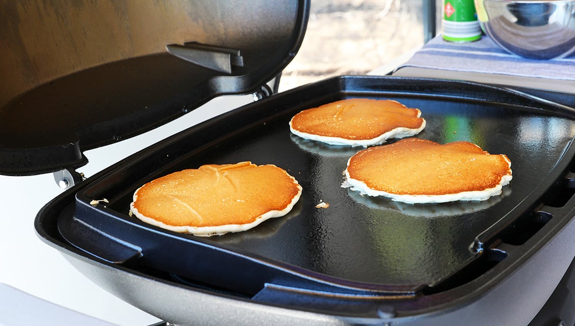 3. Either make your favourite type of pancake batter or used store-bought pancake mix. Lightly oil the barbecue’s flat plate, heat to medium temperature. Cook enough pancakes to make a stack for each person.